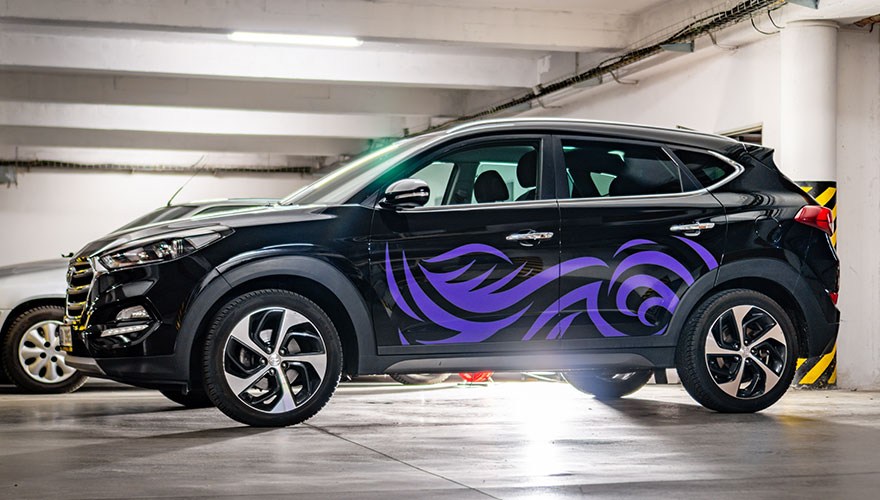 Polep s motivem šachovnice na bok auta z černé leské fólie.