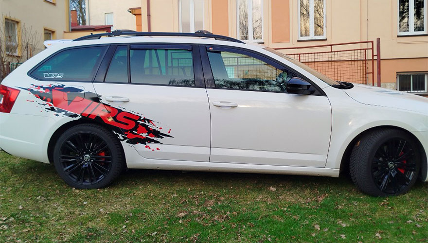Polep na bok Škody Octavia RS, dvoubarevné logo VRS s rozstříknutým pozadím.